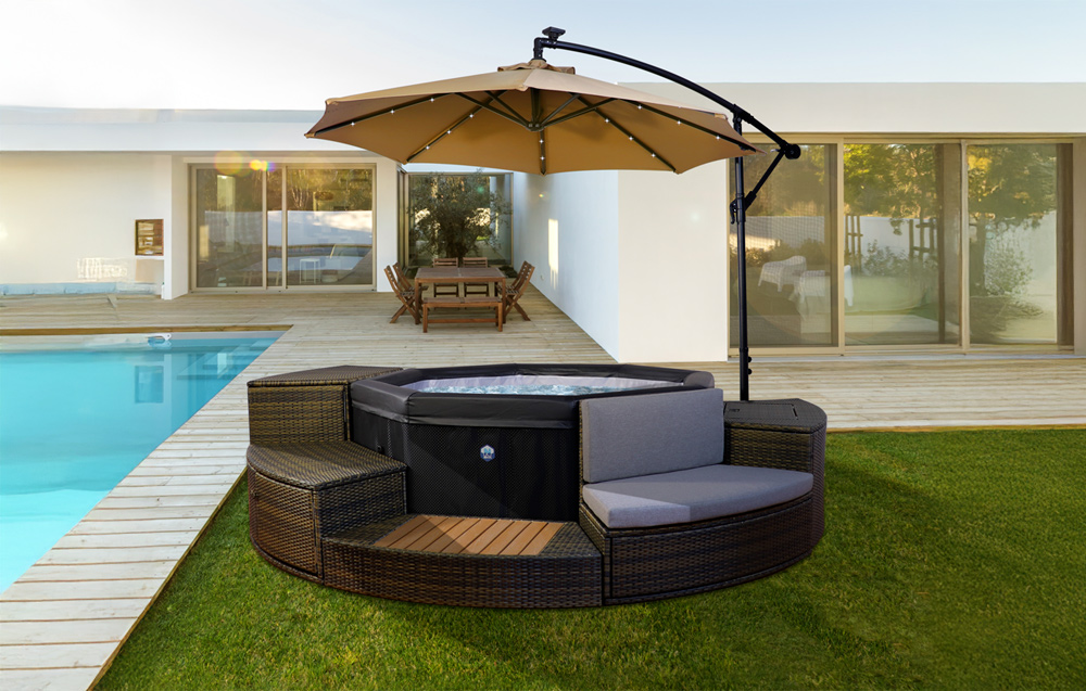 Disfruta de una solución completa con el pack Netspa: una sombrilla LED de 250 cm acompañada de su base lastrada. Ideal para tu spa o zona de descanso, proporciona una óptima protección solar durante el día y una atmósfera luminosa y relajante por la noche gracias a sus LEDs solares integrados. Robusta, móvil y elegante, es el aliado perfecto para aprovechar al máximo tu espacio exterior.
