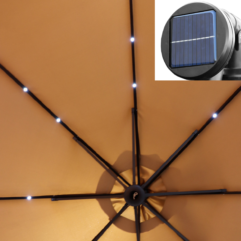 Gracias a sus 24 LEDs integrados y alimentados por panel solar, esta sombrilla crea una atmósfera luminosa ideal al caer la noche.
