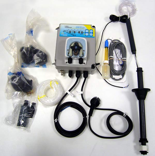 4m x 6,5 de tubo de descarga de polietileno 4 x 6, un electrodo pH, válvula de inyección con labio y reducción, abrazaderas de fijación, filtro de aspiración, porta sonda, kit de solución, estribo de fijación mural, tornillos de fijación suministrados.