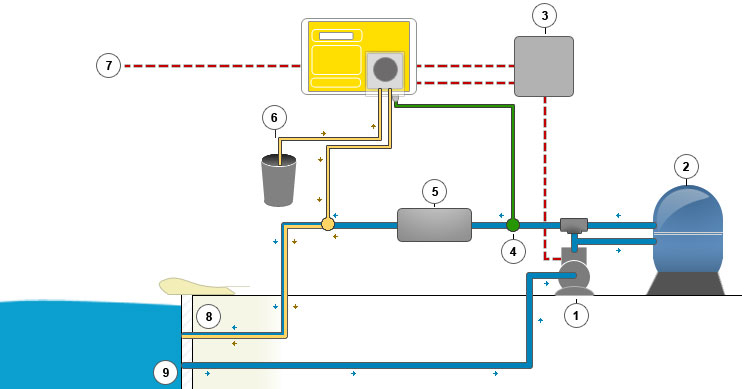 La Regulación automática con bomba dosificadora Dinotec Easydos permite la inyección automática de todos los desinfectantes líquidos (oxígeno activo, cloro y demás).
