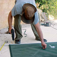 Colocar el primer poste en la anclaje PVC. Tensar el galon de abajo y marcar el sitio del agujero siguiente con un lapiz. Servirse de la malla como plantilla para marcar los agujeros y después perforar los agujeros uno después del otro.