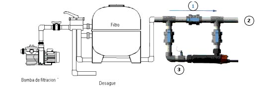 Se debe instalar en el circuito de flujo reversible y anterior a cualquier sistema de tratamiento químico (bombas dosificadoras, clorador, electrolizador,..). Se recomienda una instalación by-pass para facilitar las intervenciones eventuales en el calentador. La posición del calentador es libre, pero es preferible prever una configuración que permita sacar las resistencias del cuerpo sin tener que desconectar el calentador de la red hidráulica, facilitando así la evacuación de burbujas del cuerpo.