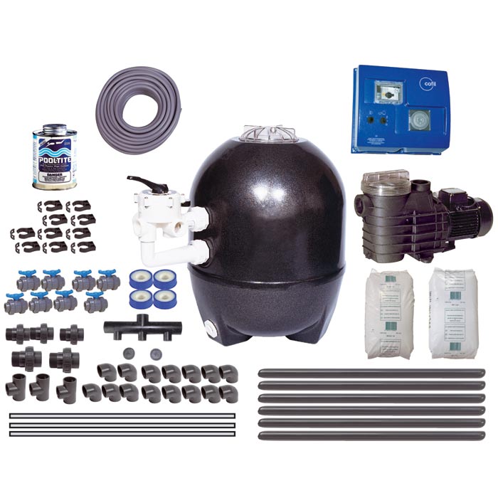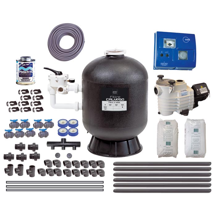 Material completo para la instalación técnica de su piscina, incluye filtro, bomba, caja eléctrica, válvulas, colectores, codos, pegamento, tubo de PVC, cable eléctrico...