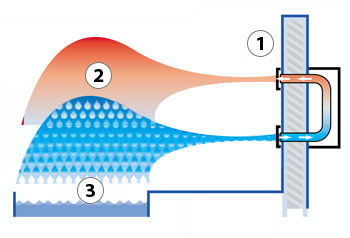 El aire húmedo procedente del local es aspirado por el ventilador integrado en el deshumidificador. El aire que pasa por el evaporador es enfriado por debajo del punto de rocío, y el vapor de agua es condensado. El aire, ahora seco, pasa luego por el condensador dónde es recalentado y reenviado hacia el recinto donde se encuentra la piscina.
