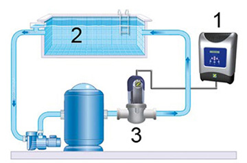 • El electrolizador se instala en la filtración de la piscina. Mediante electrolisis, por la célula, la sal se transforma en Cloro, un poderoso desinfectante, instantáneamente disuelto en el agua.