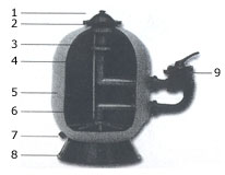 3. Difusor alto integrado que garantiza una distribución homogénea del agua en el lecho de arena. Tubos interiores dimensionados para reducir la pérdida de carga.