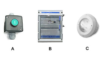 El pulsador (A), está conectado a la caja eléctrica (B) de su piscina que alimenta su foco (C).