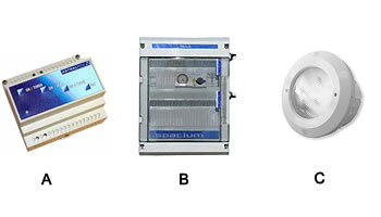 El Receptor-Modulador (A), está conectado a la caja eléctrica (B) de su piscina que alimenta su foco (C).