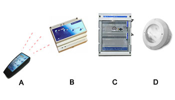 El mando a distancia (A), envía las informaciones al Receptor-Modulador ( B) conectado a la caja eléctrica (C) de su piscina que alimenta el foco (D).