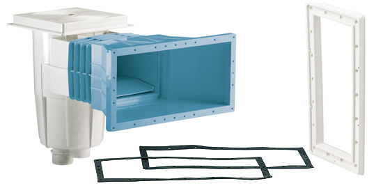 Skimmer de ABS azul, tratado anti-UV en las partes exteriores, serie estándar, capacidad de 15 litros, boca ancha para piscinas de hormigón o liner.