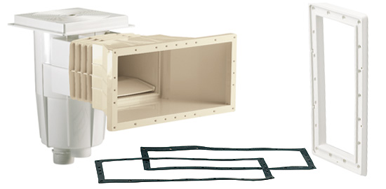 Skimmer de ABS beige, tratado anti-UV en las partes exteriores, serie estándar, capacidad de 15 litros, boca ancha para piscinas de hormigón o liner.