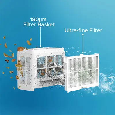 Combina una cesta de 180 micrón para residuos grandes (hojas, insectos...) y un filtro de 10 micrón para capturar partículas muy finas (polvo, arena, polen).