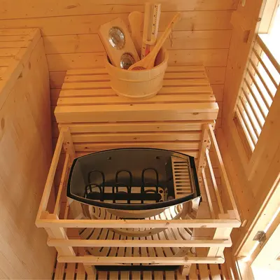 Según la estufa elegida, el sauna puede alcanzar aproximadamente 80?°C en 30 a 45 minutos. Añadir agua sobre las piedras permite generar vapor y aumentar la sensación de calor.