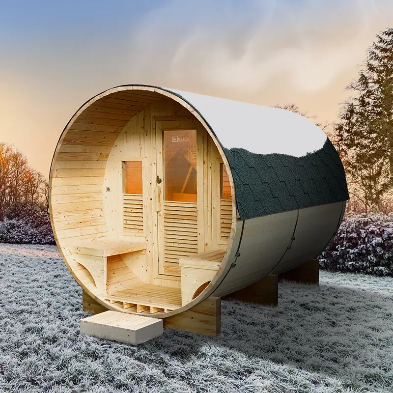 El sauna está fabricado en abeto canadiense, una madera maciza conocida por su suavidad, tono claro y cualidades aislantes.
