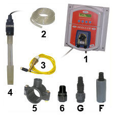 1 panel Regulus con bomba peristáltica , 1 captador de temperatura , 1 sonda de pH, 1 acceso de inyección de bomba dosificadora (filtro + inyector + flexibles), 1 porta sonda, 1 kit de inyección PVC 50.
