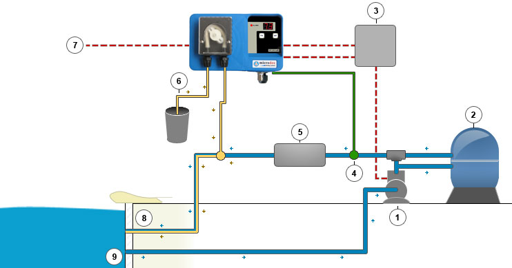 Gracias a la regulación automática del PH MICRODOS, usted decide el PH ideal que desea para el agua de su piscina (pre regulada a 7.3). Una sonda situada en el circuito de filtración mide el PH del agua, si este es diferente al PH que desea, la bomba de inyección se pone en marcha e inyecta en el circuito de filtración la cantidad justa del corrector del PH. La bomba es de tipo peristáltico, permitiendo así un funcionamiento silencioso.
