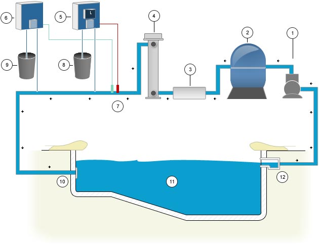 La bomba dosificadora inyecta cada dia una pequeña cantidad de producto remanente (oxigeno remanente activo) sin cloro con el fin de obtener un agua desinfectante y anticipar la aparicion de algas. Una sonda regula automaticamente las inyecciones de BIO-UV Oxigeno remanente en funcion de la temperatura del agua.