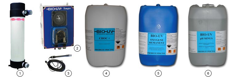 La bomba dosificadora inyecta cada dia una pequeña cantidad de producto remanente (oxigeno remanente activo) sin cloro con el fin de obtener un agua desinfectante y anticipar la aparicion de algas. Una sonda regula automaticamente las inyecciones de BIO-UV Oxigeno remanente en funcion de la temperatura del agua.