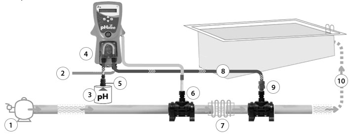 Nota:Si se emplean un calentador y una célula de electrolisis salina, deberán situarse entre la sonda del pH y el inyector del corrector de pH - o ph + como lo indica el siguiente diagrama :